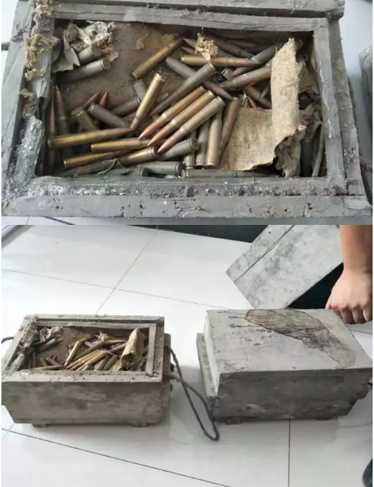 16日,颍东区居民龚某将家中危房推倒的时候,在墙角土堆处发现了两箱子弹龚某立刻报警,颍东区杨楼派出所民警,立即将两箱1952年制造的步枪用子弹带回并妥善存放,