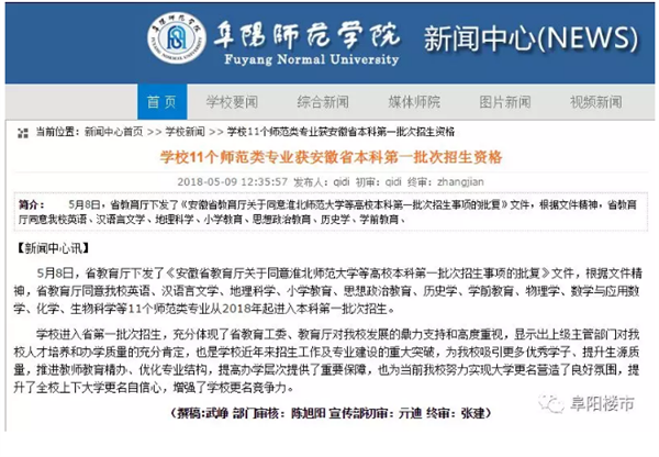 5月8日,省教育厅下发了《安徽省教育厅关于同意淮北师范大学等高校本科第一批次招生事项的批复》文件,根据文件精神,省教育厅同意我校英语、汉语言文学、地理科学、小学教育、思想政治教育、历史学、学前教育、物理学、数学与应用数学、化学、生物科学等11个师范类专业从2018年起进入本科第一批次招生。