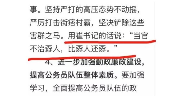 "当官不治孬人,比孬人还孬!"崔黎这句话,应该在4年前就说过。据阜南县人民政府网2015年12月26日显示,时任柴集镇镇长的朱新胜在该镇九届三次人代会上作《政府工作报吿》时就引用过崔黎这句话。
